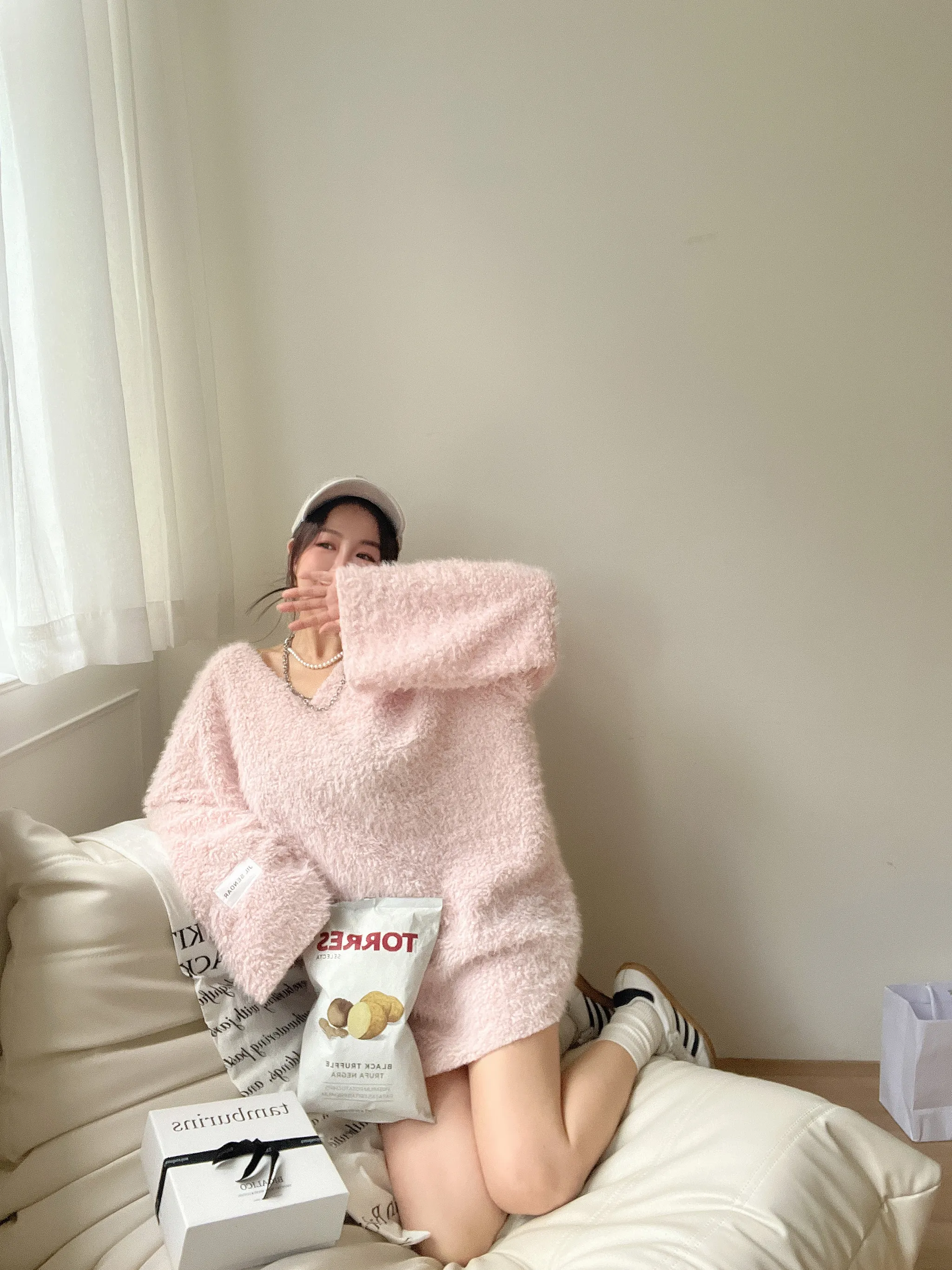 手袖標籤V領絮質毛毛衣