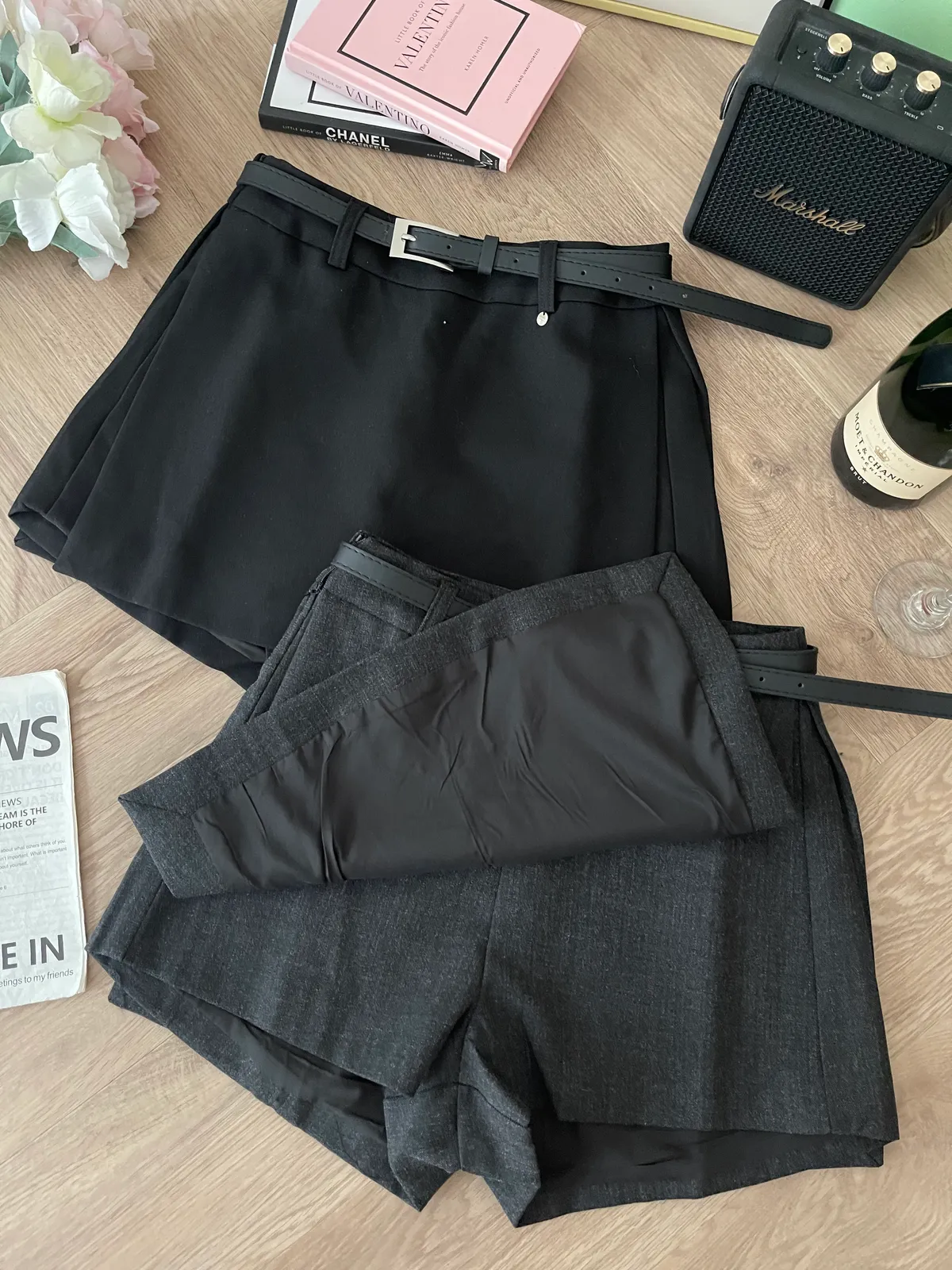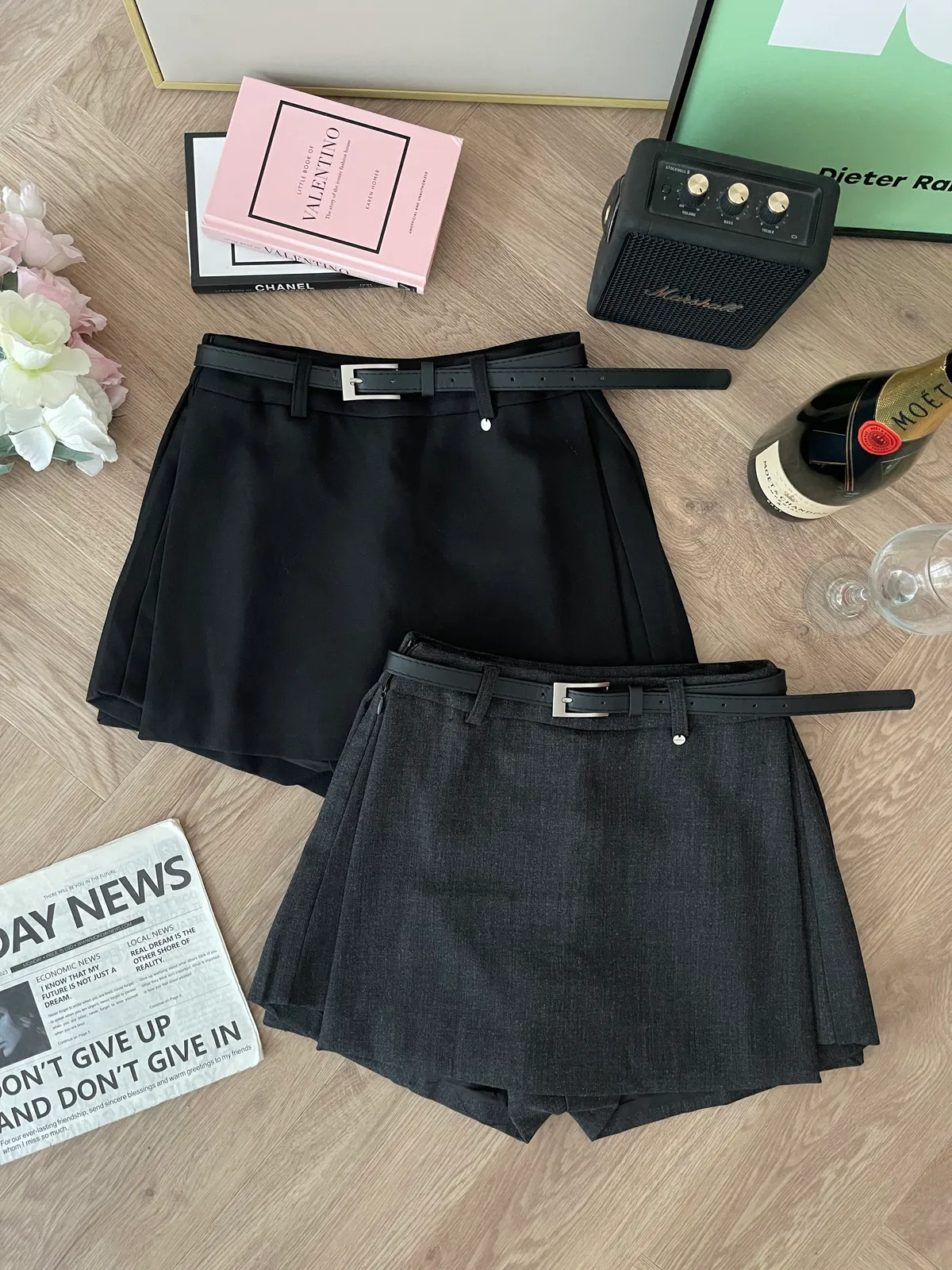 側開衩西裝褲裙(附皮帶)