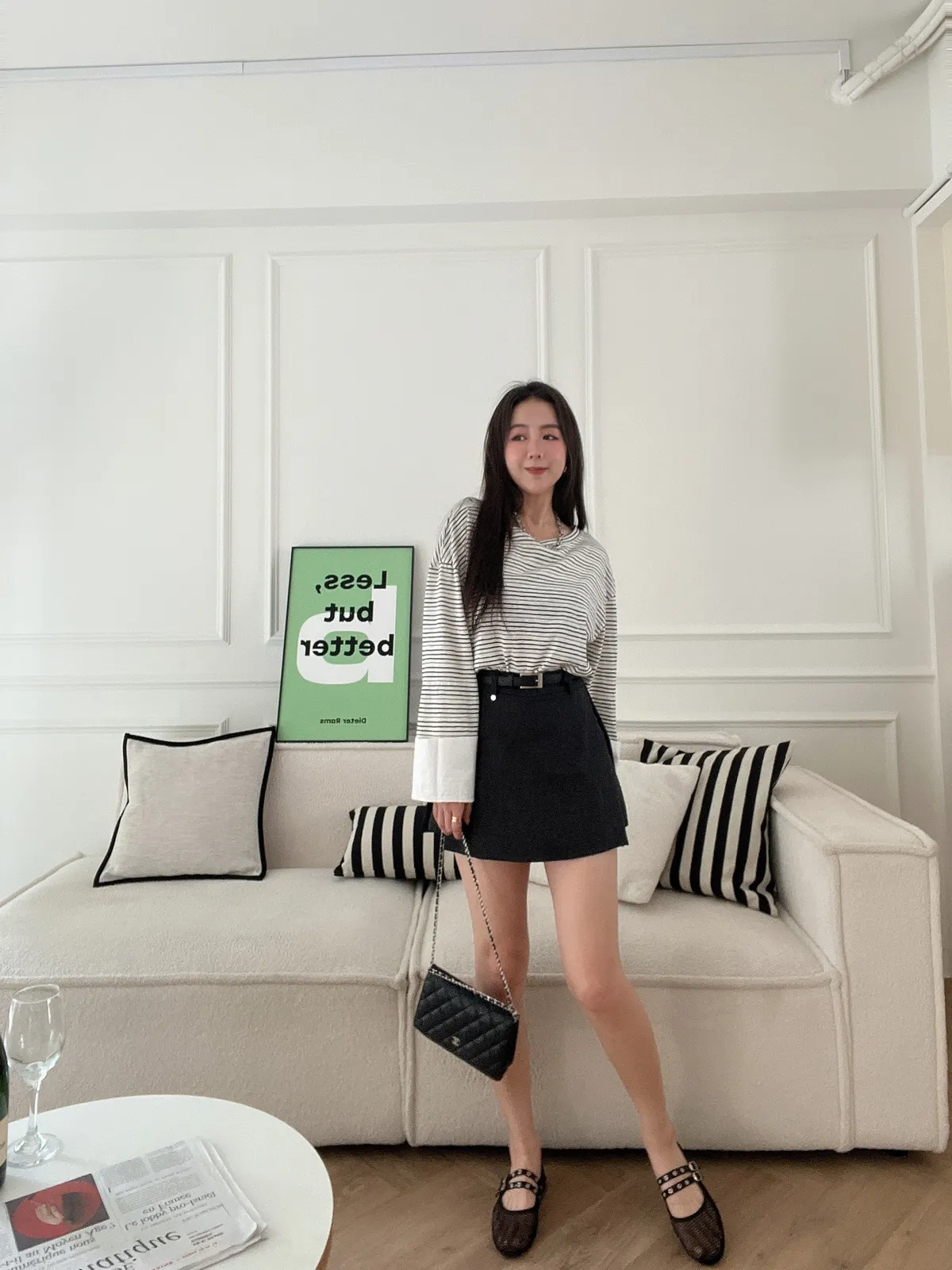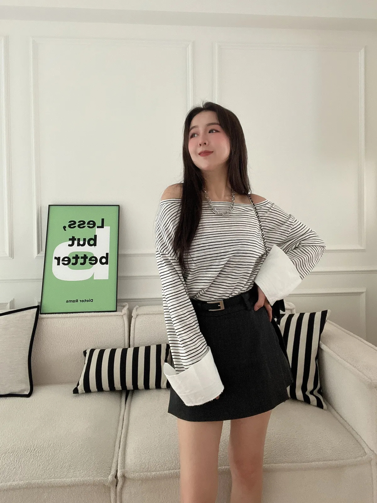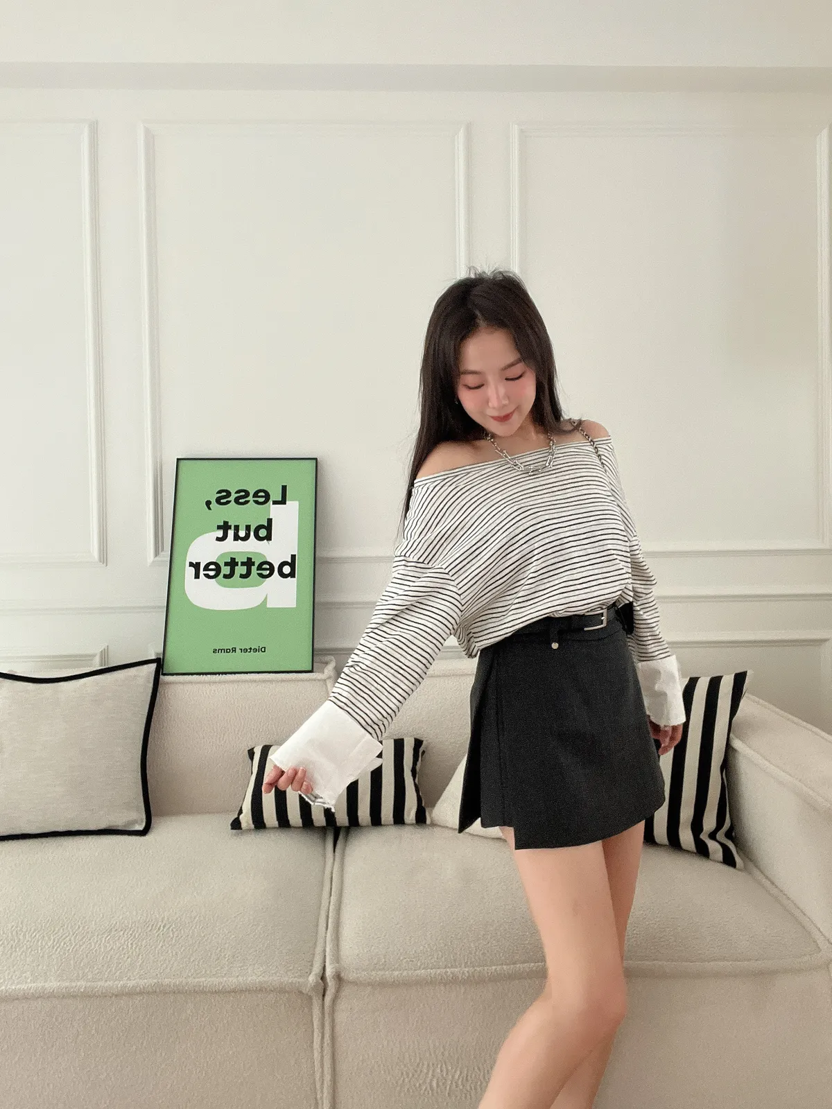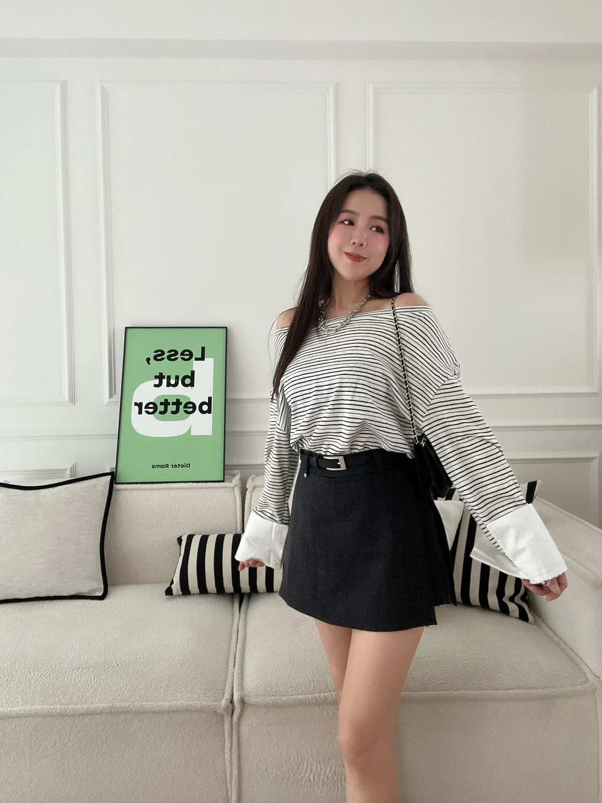 條紋大領襯衫袖上衣(附造型腰帶)