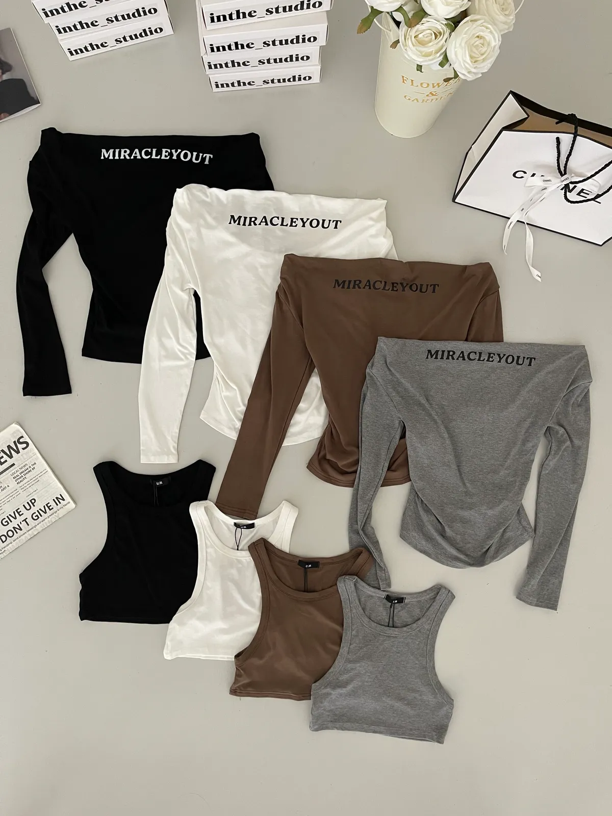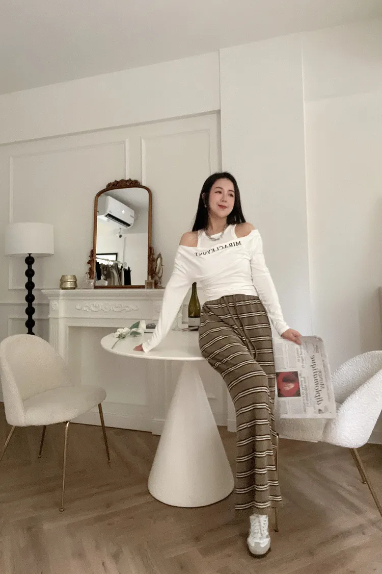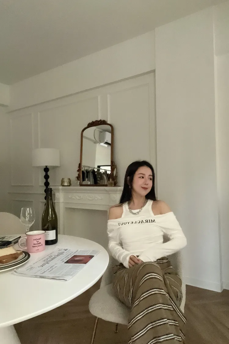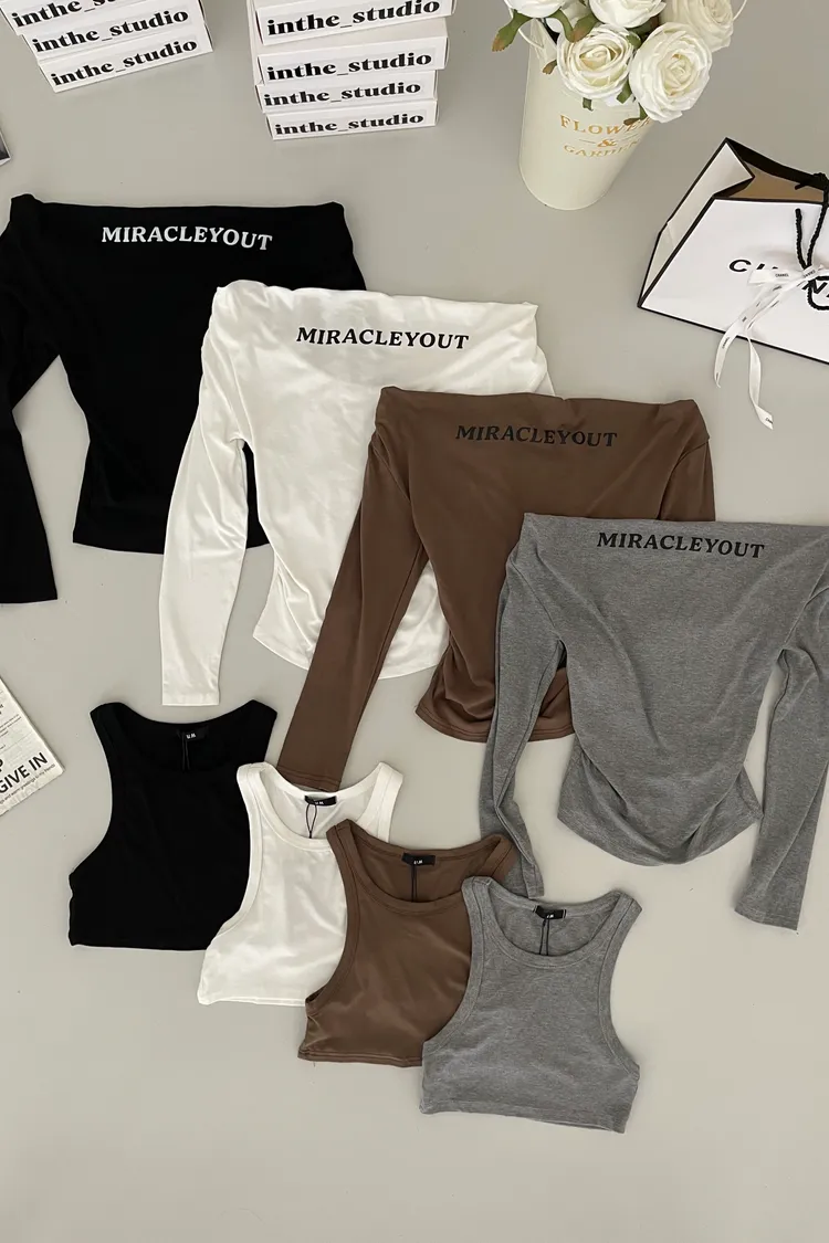 📝簡約英文字一字肩上衣+挖背背心 兩件式