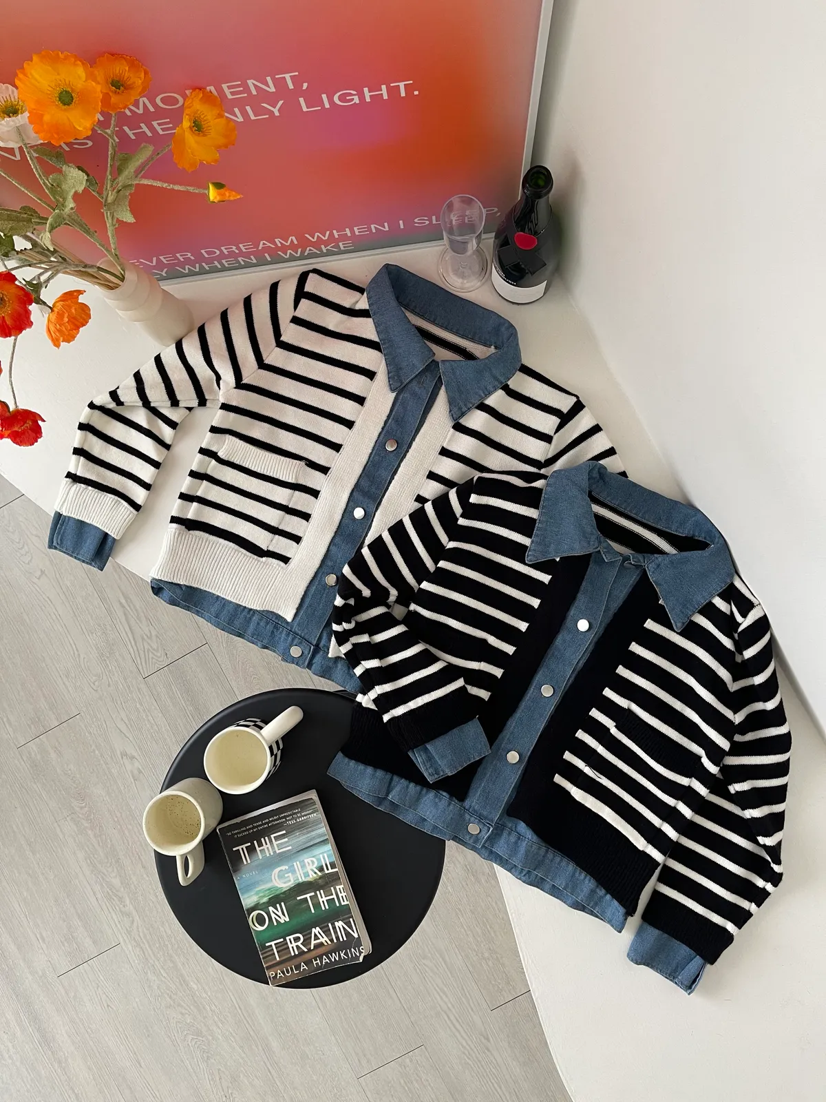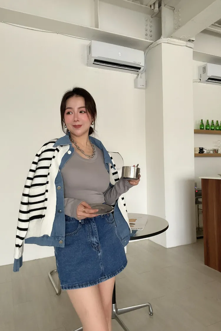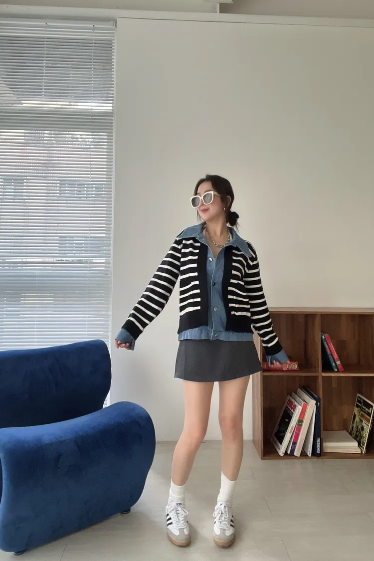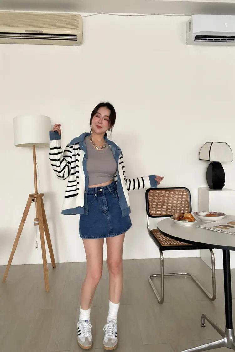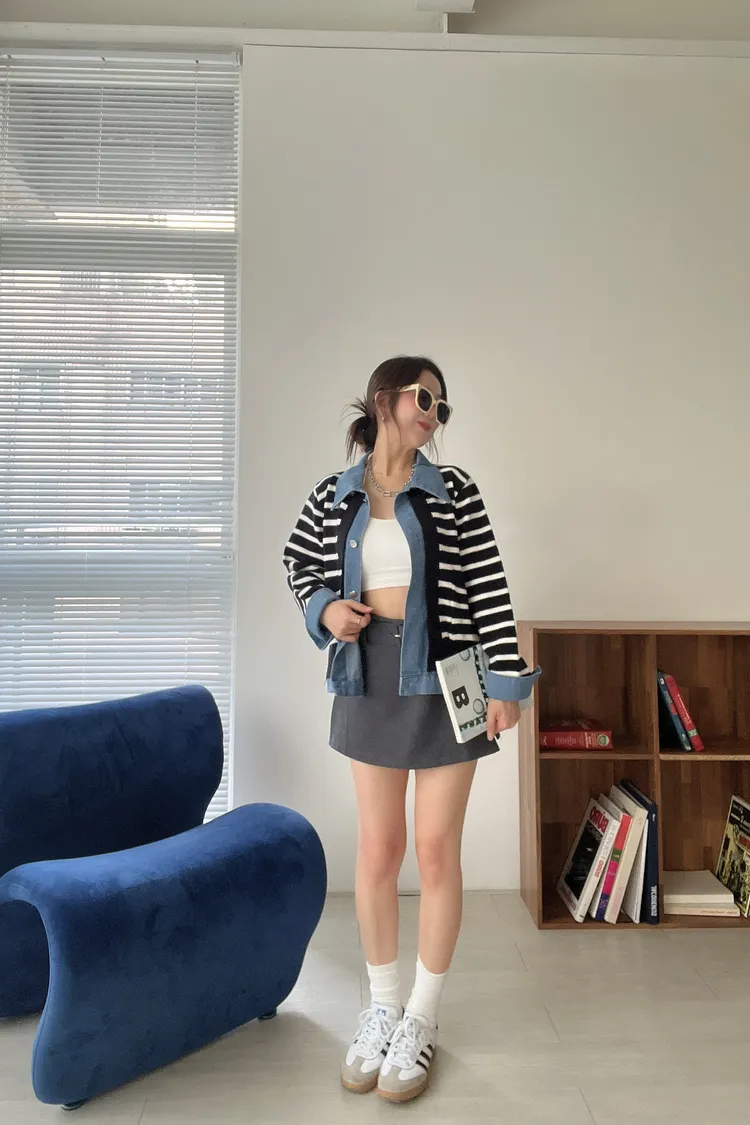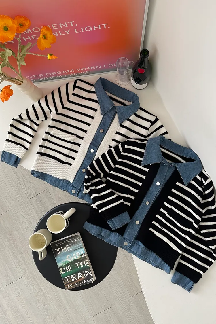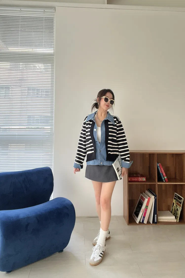 時髦💫假兩件針織拼接牛仔外