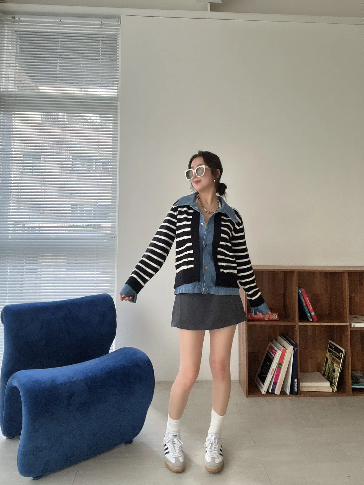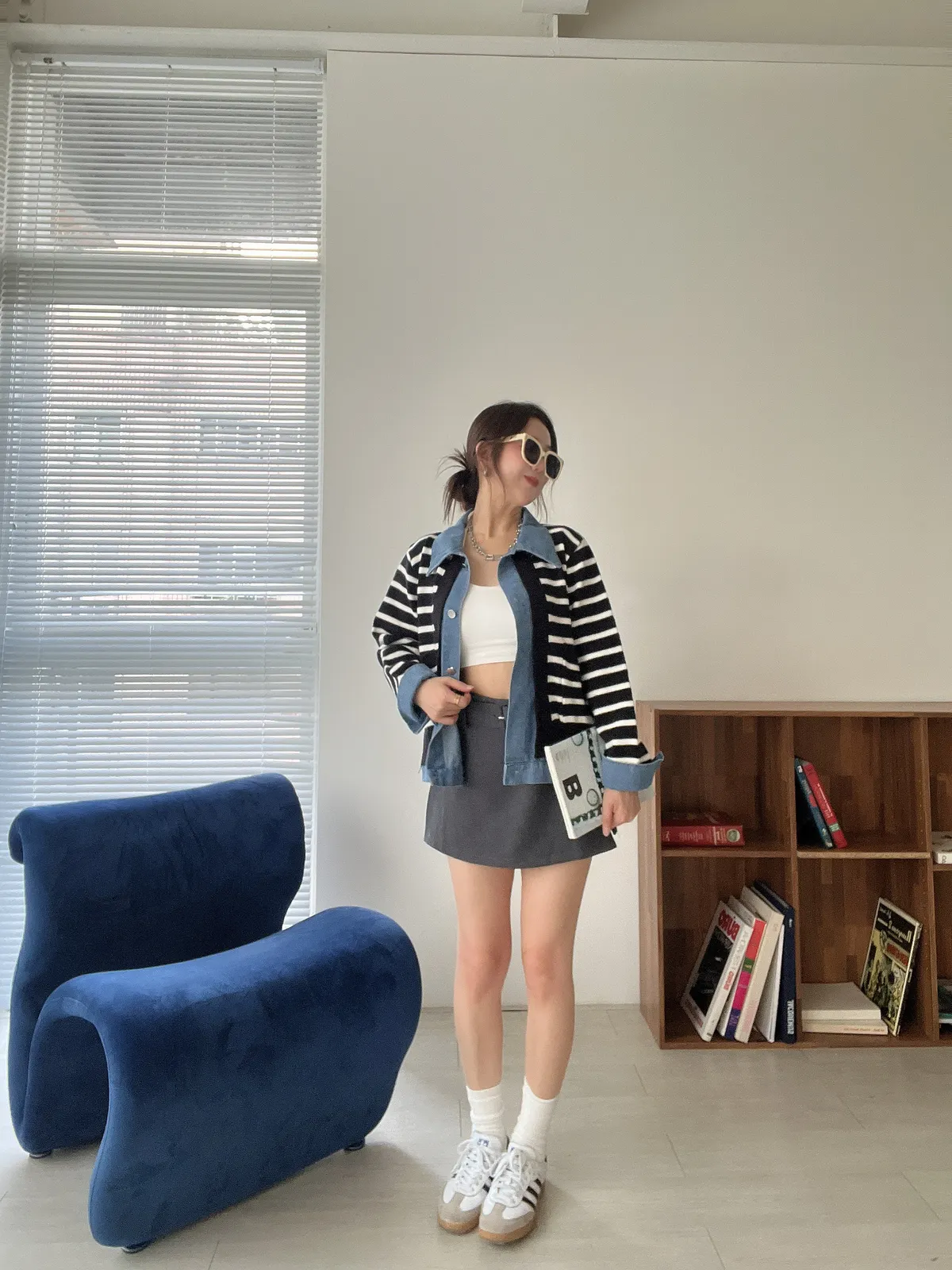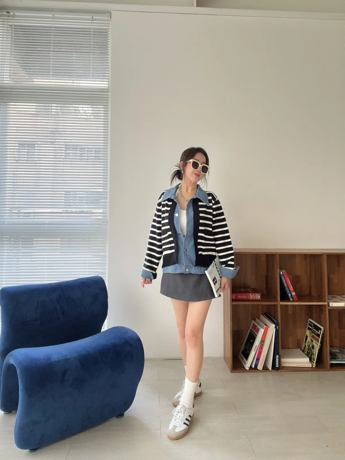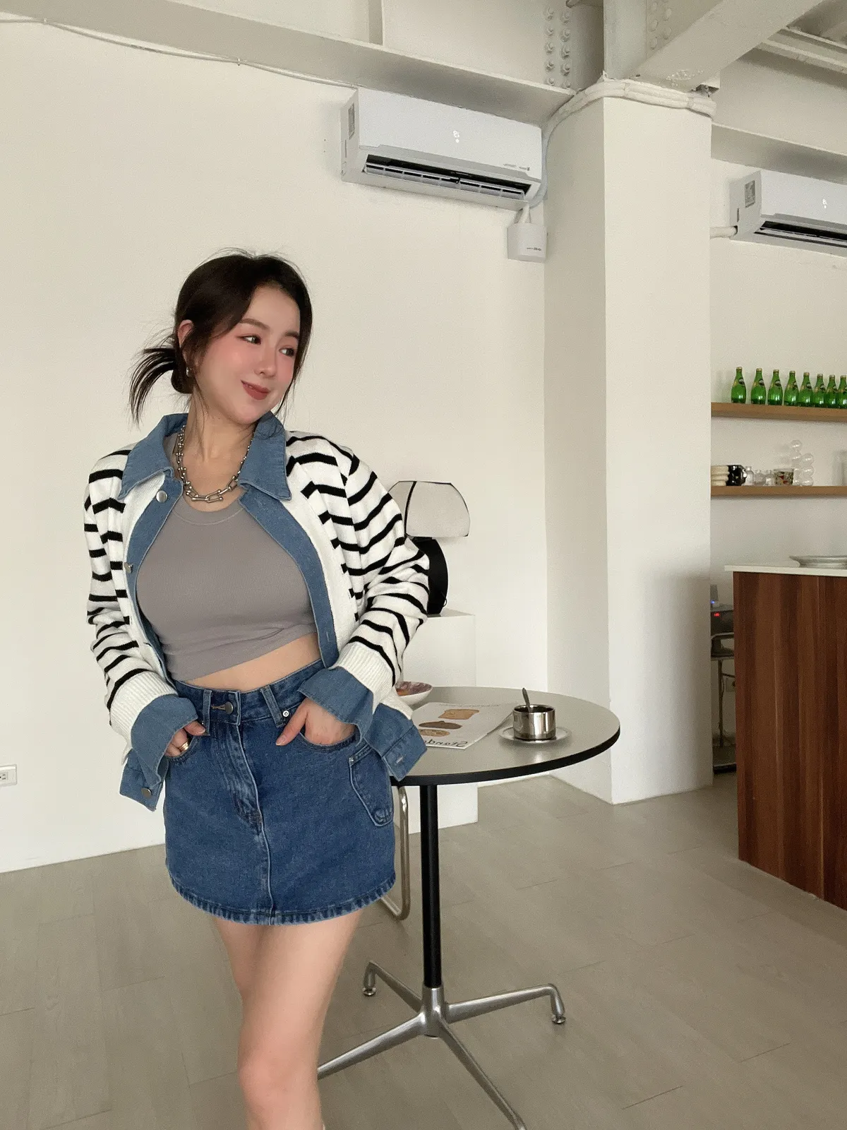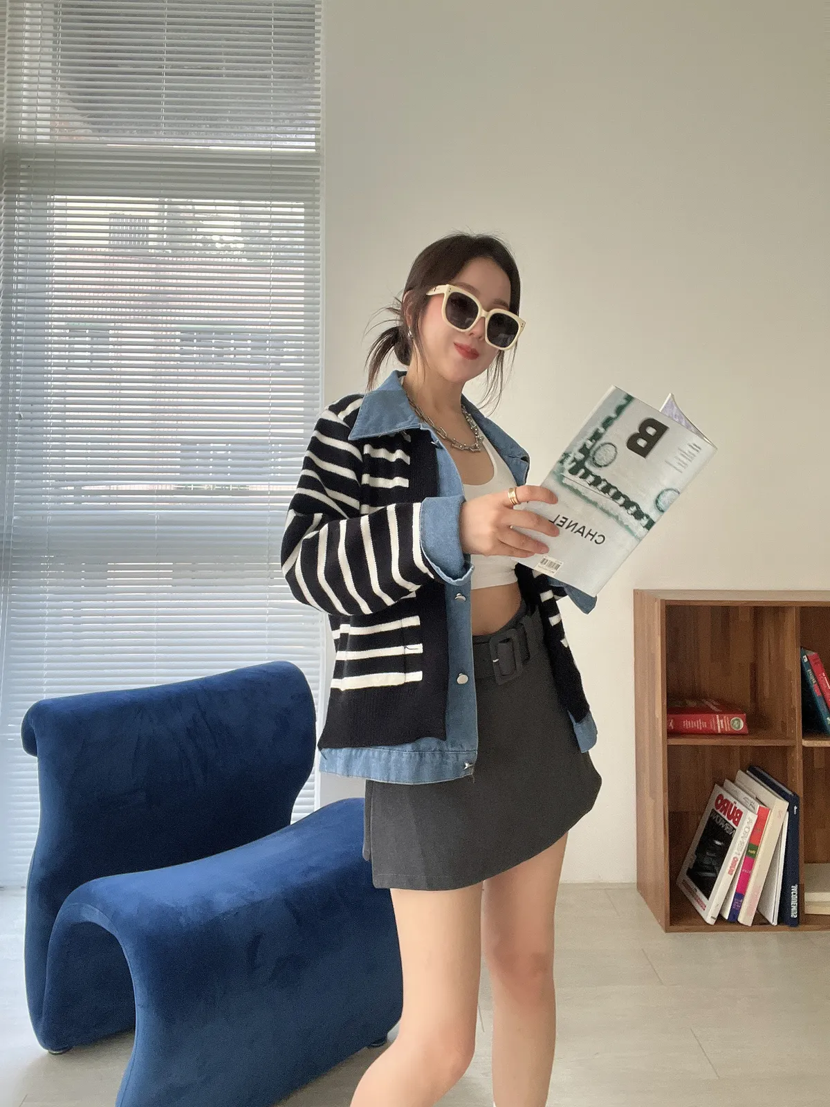 時髦💫假兩件針織拼接牛仔外