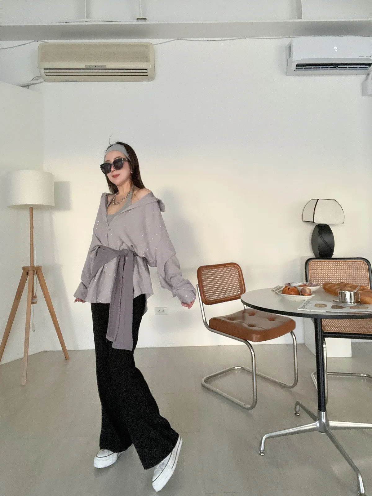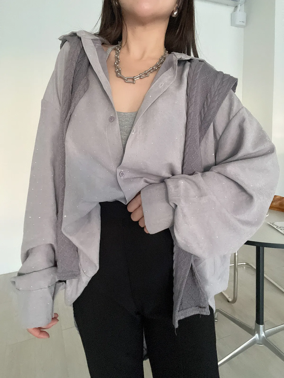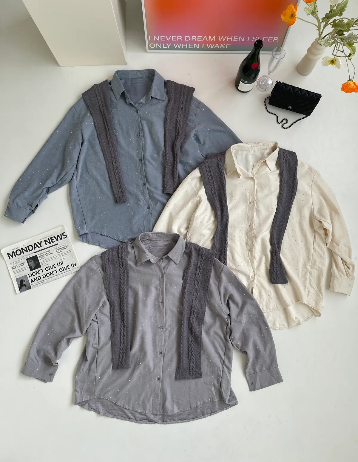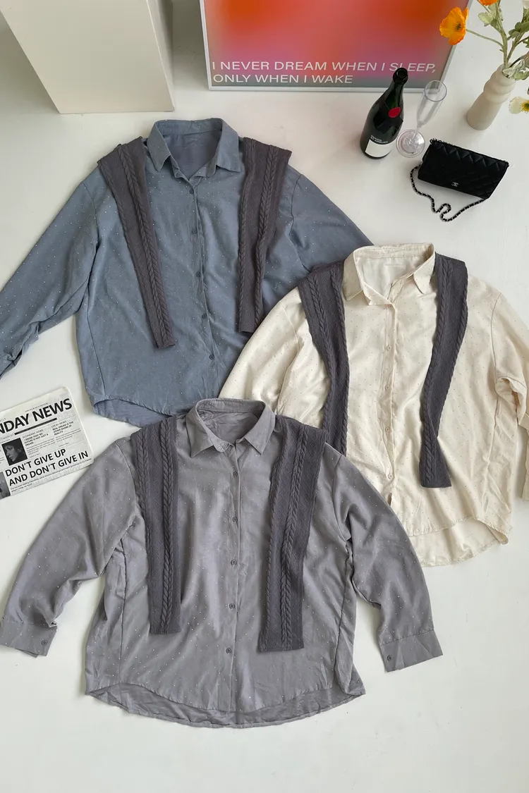 低調奢華✨小燙鑽造型襯衫+麻花編織披肩Set
