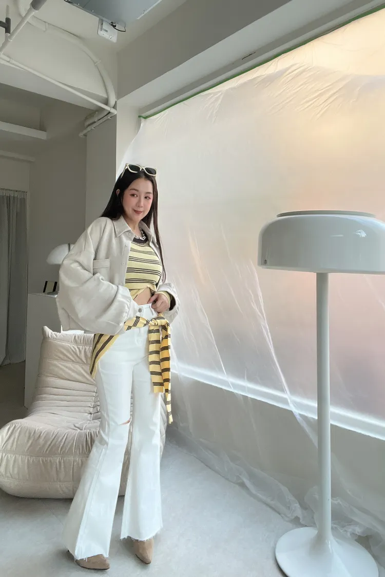 單邊割破彈性牛仔喇叭褲