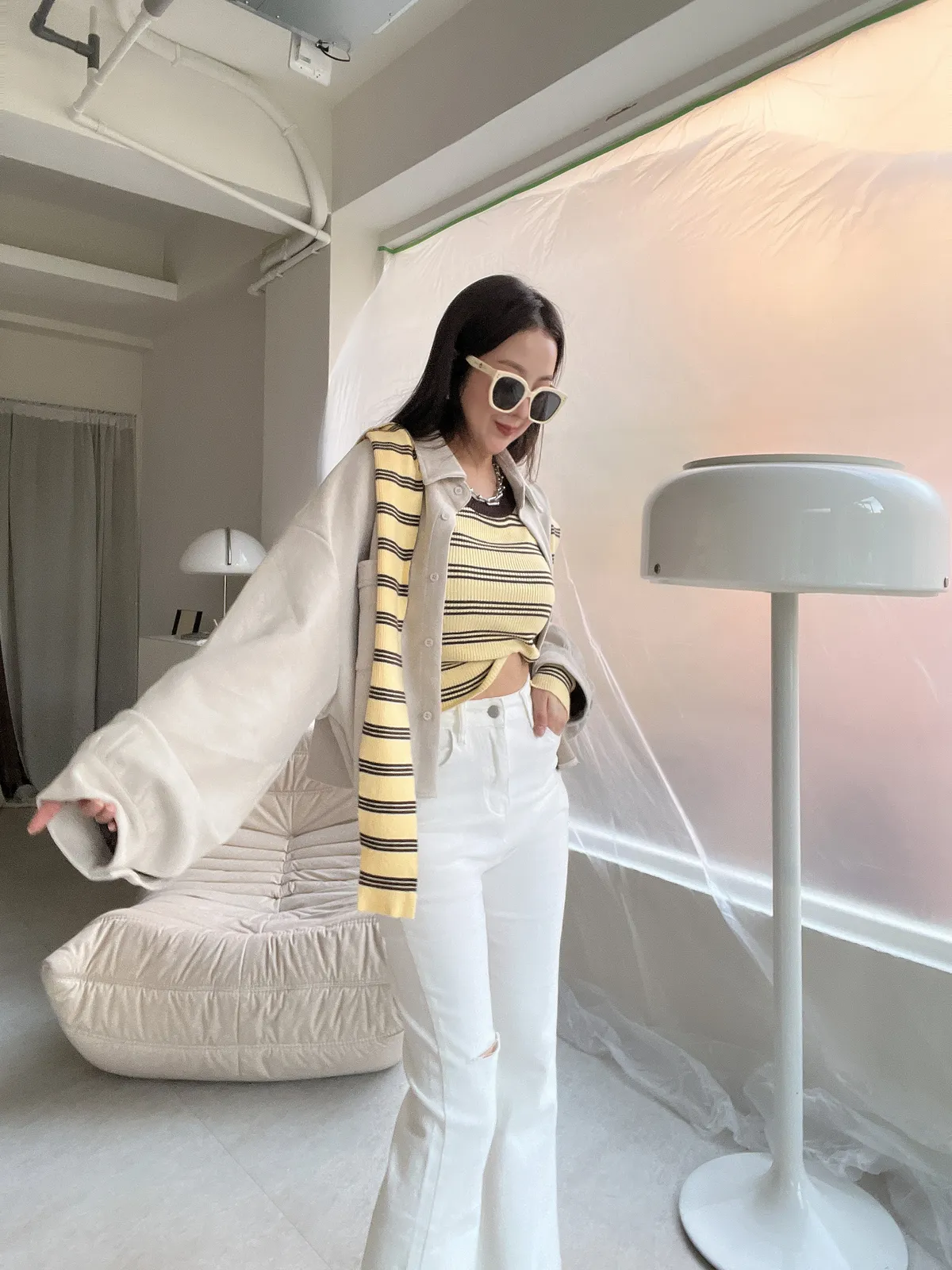 條紋彈力上衣+披肩SET