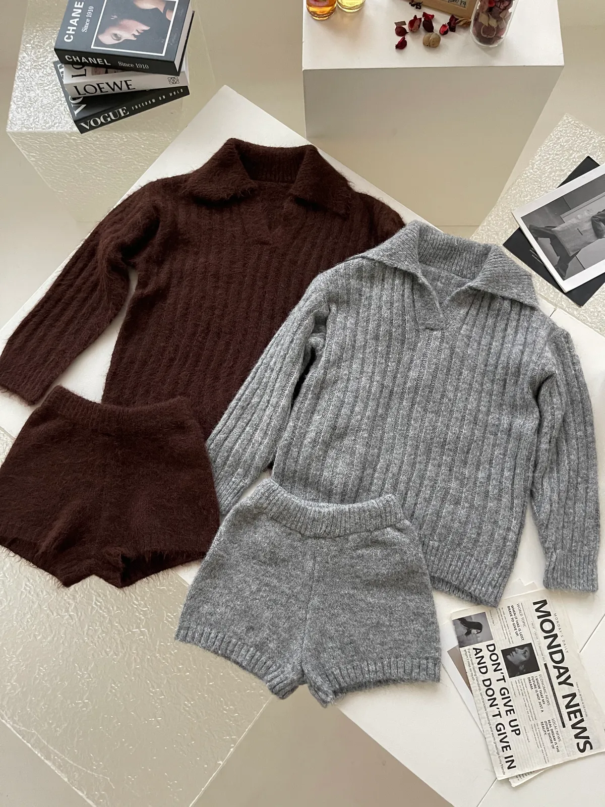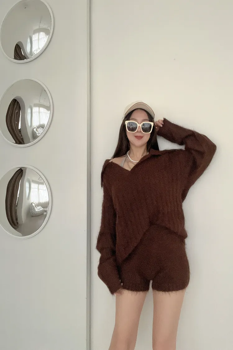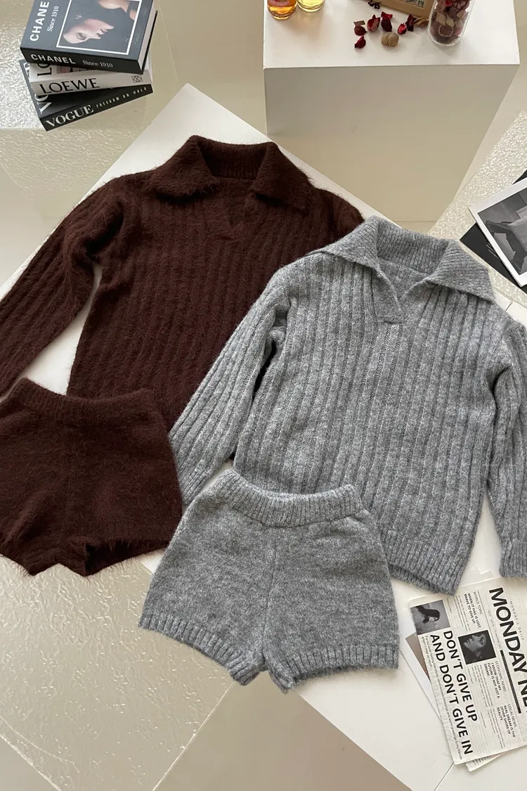 11/21慵懶風☕仿兔絨翻領坑紋毛衣+短褲套裝